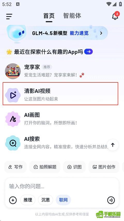 1、在智谱清言首页找到并点击清影AI视频功能。