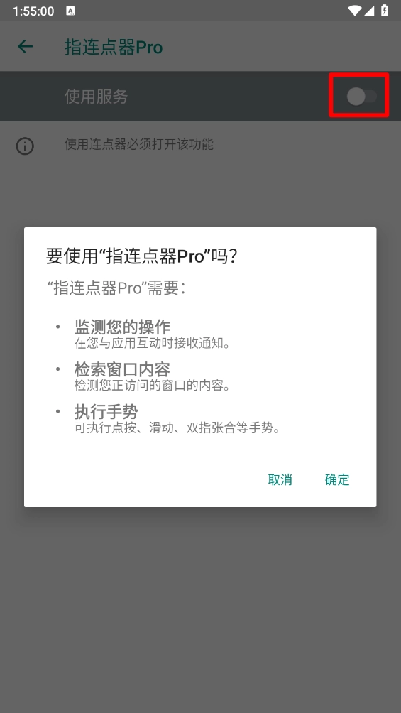 4、如图所示,打开指连点器Pro的使用服务开关,然后回到主页。