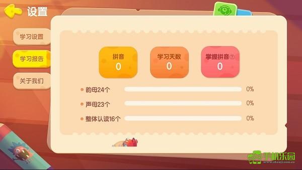 3、设置功能:点击“设置”选项即可进入对应的操作界面,家长能够在这里对学习进度、教学流程、使用时间以及背景音乐等各项参数进行调整与配置。