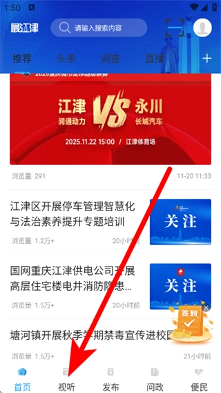 打开最江津,点击底部视听,进入视听页面。