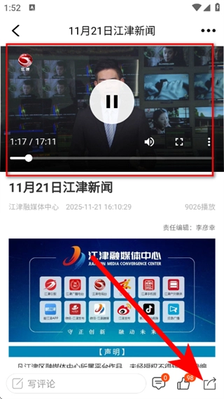 在新闻播放页面,点击分享图标。
