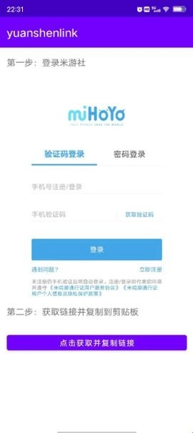 打开yuanshenlink,在其登录界面登录米游社(建议选择验证码登录方式),接着点击页面最下方的“点击获取并复制链接”按钮(出于账户安全考虑,建议使用完毕后退出登录,并及时修改密码)