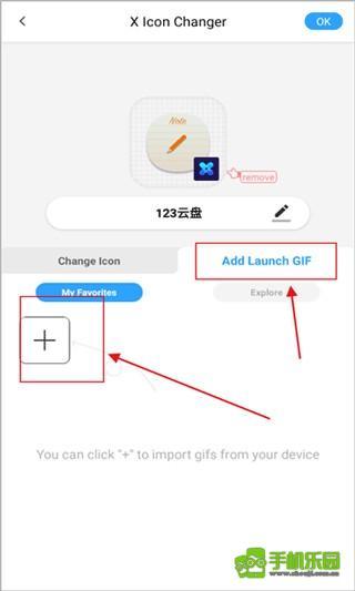 6、点击“add launch gif ”,然后点击加号,新增GIF动图,在新应用图标启动时播放有趣的GIF动画。