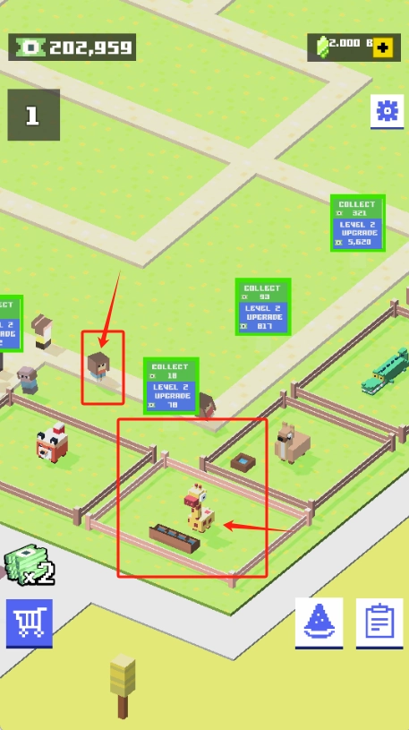 升级围栏来饲养动物,消耗资源提升围栏等级,从而解锁更多能赚取收益的项目。