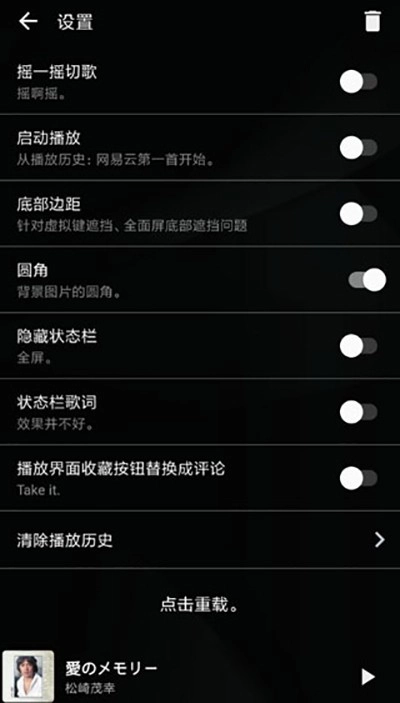 进入设置页面后,用户也能尝试开启“摇一摇切歌”“状态栏歌词”“底部边距”等功能,以此提升播放体验。