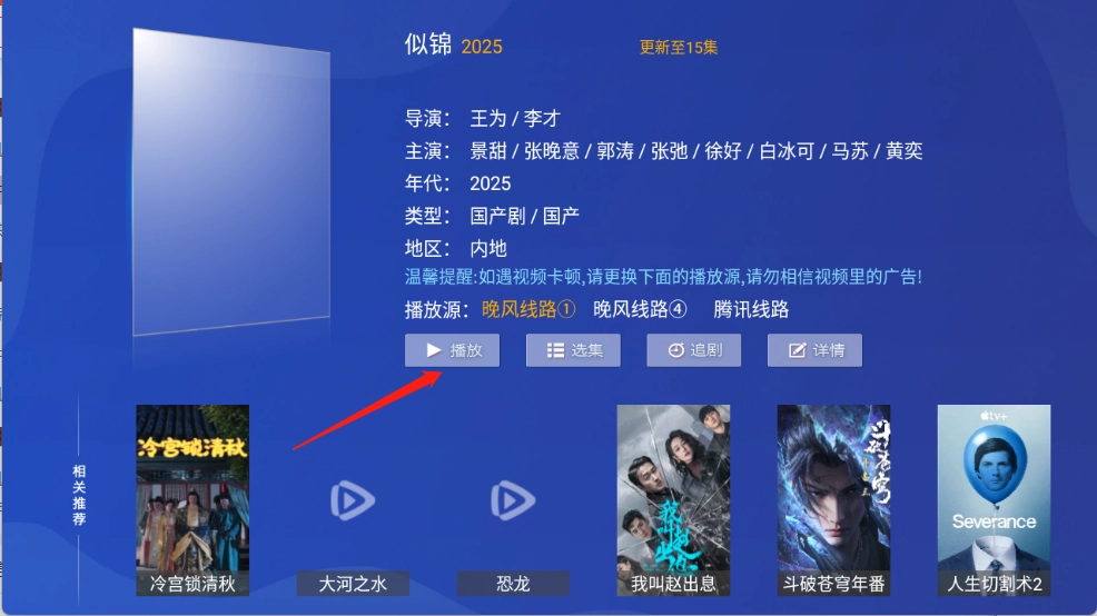 4、用户点开喜欢的影视资源进入详情页点击“播放”。