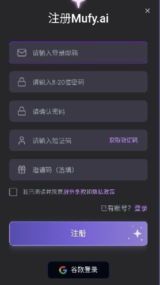 在当前网页完成mufy的安装后,启动软件时需要先执行登录注册步骤。