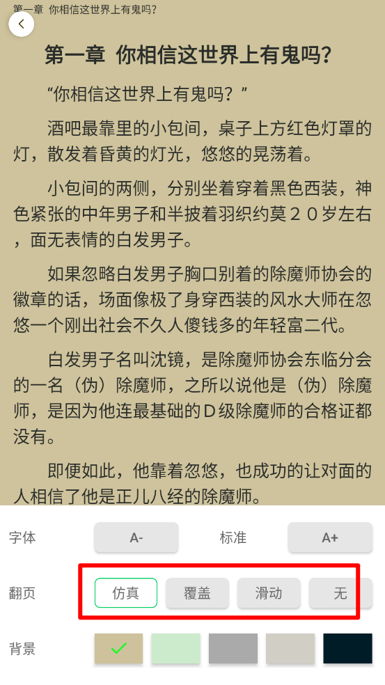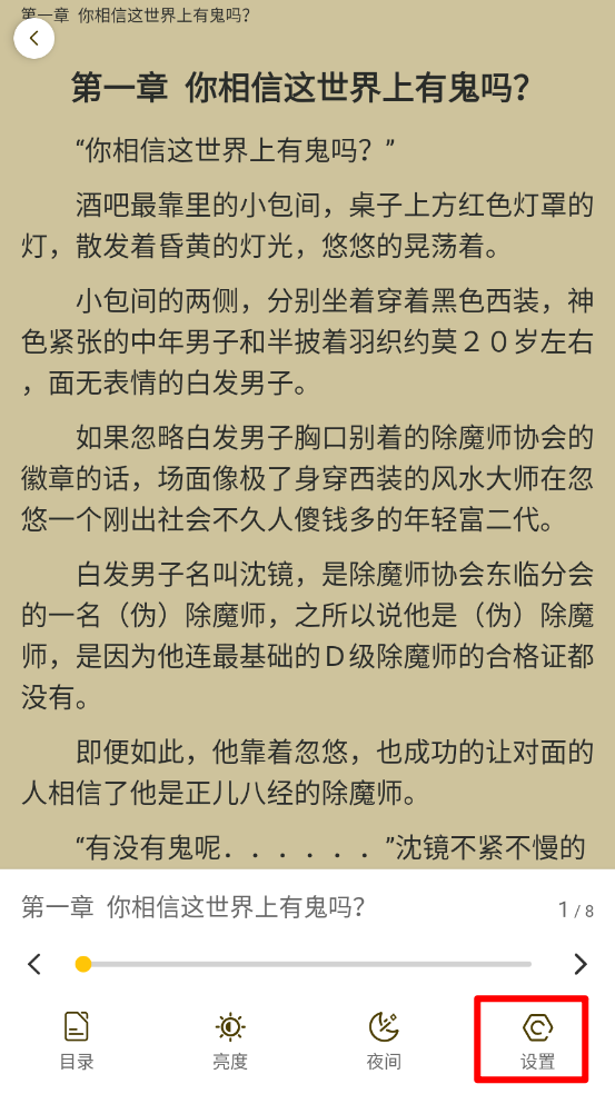 在阅读界面点击中间区域呼出菜单,然后点击右下角的“设置”选项。