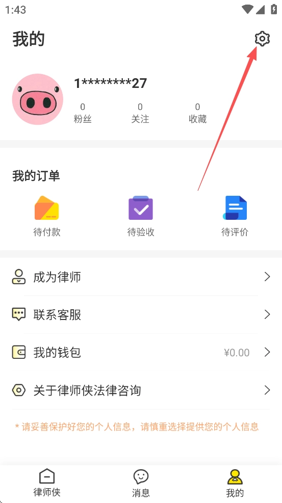 打开律师侠 App,在界面里找到并点击底部或者顶部的【我的】入口,然后进入个人中心。