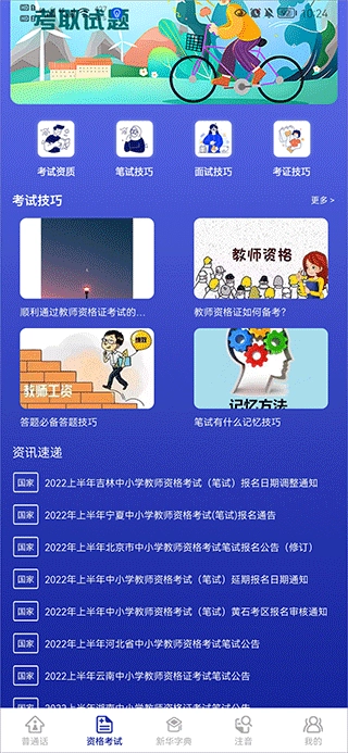 在资格考试界面里,用户能够详细知晓中小学教师资格证的笔试技巧、面试技巧,还有实时更新的公告,以此助力用户更顺利地通过考试。