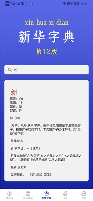 在新华字典界面里,用户只需在搜索框输入想要查询的字词,就能详细了解该字词的拼音、注释等相关信息。