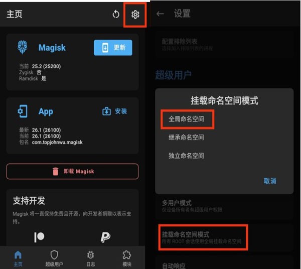1、首先把Magisk的“挂载命名空间模式”调整为“全局命名空间”。