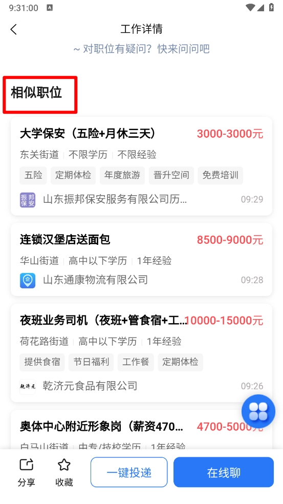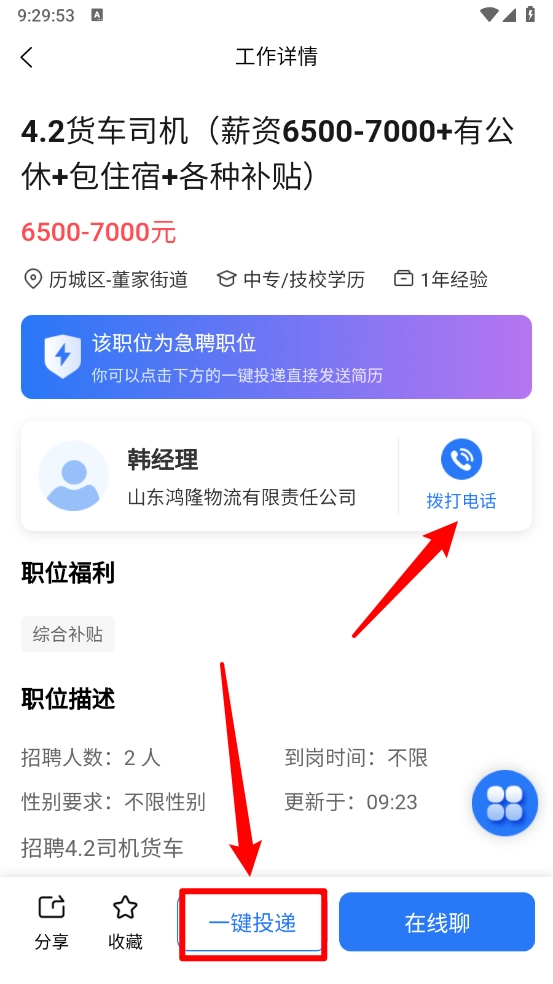 5、进入工作详情页,可以直接一键投递和拨打电话。