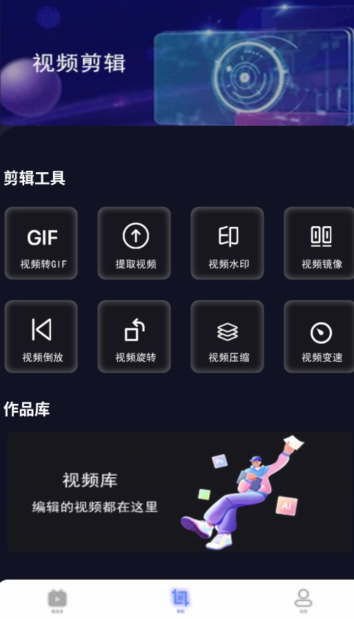 底部导航栏的正中央设有“视频剪辑”工具的入口,里面包含了各式各样的编辑功能模块。