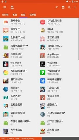 启动App Usage后,该应用会先加载并展示设备上所有已安装的应用程序列表。在这个界面中,你能够查看每个应用的基础情况,像是否已卸载、安装的时间以及使用记录等详细内容。有一点需要留意,所有和时间相关的统计信息(比如使用时长、安装日期等)都是从你安装App Usage并首次打开它之后才开始记录的,并不包含之前的历史数据。