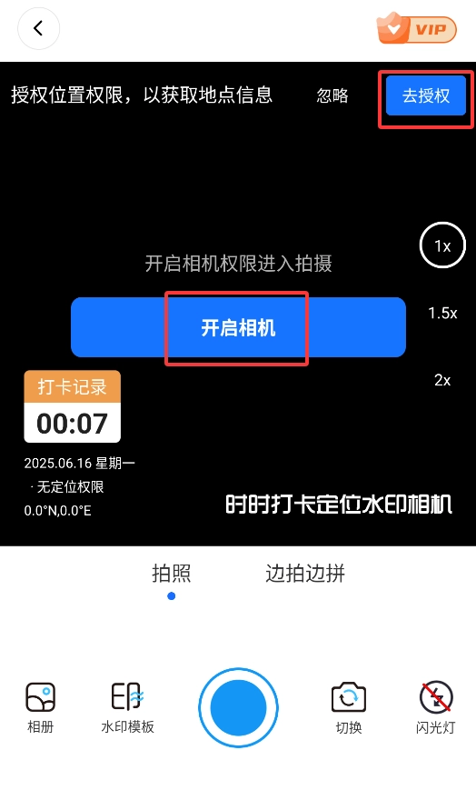 请按照指引依次开启相机访问权限与位置权限,这样才能保证水印信息正常显示。