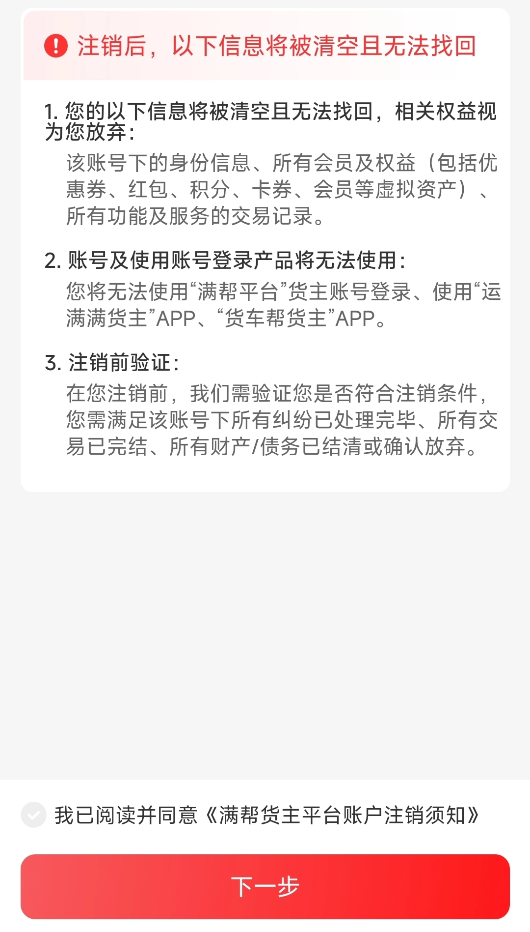 先勾选下方注销协议,再点击【下一步】