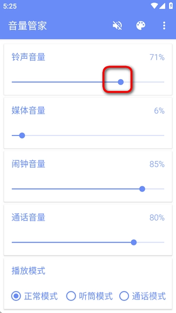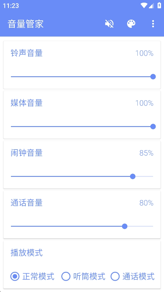 音量管家是一款简洁实用的安卓手机音量调节工具。借助音量管家安卓版,用户能一键调整铃声、媒体、闹钟、通话等多项系统音量,同时它还配备了正常模式、听筒模式与通话模式这三种不同的播放模式。无论是听歌、看视频亦或是打电话,都可以通过音量管家最新版实现更具个性化的音量配置!