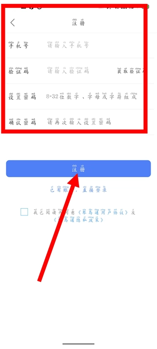 请按以下步骤完成账号注册:先依次填写手机号、验证码,接着设置并确认密码,随后勾选相关选项,最后点击注册按钮即可。