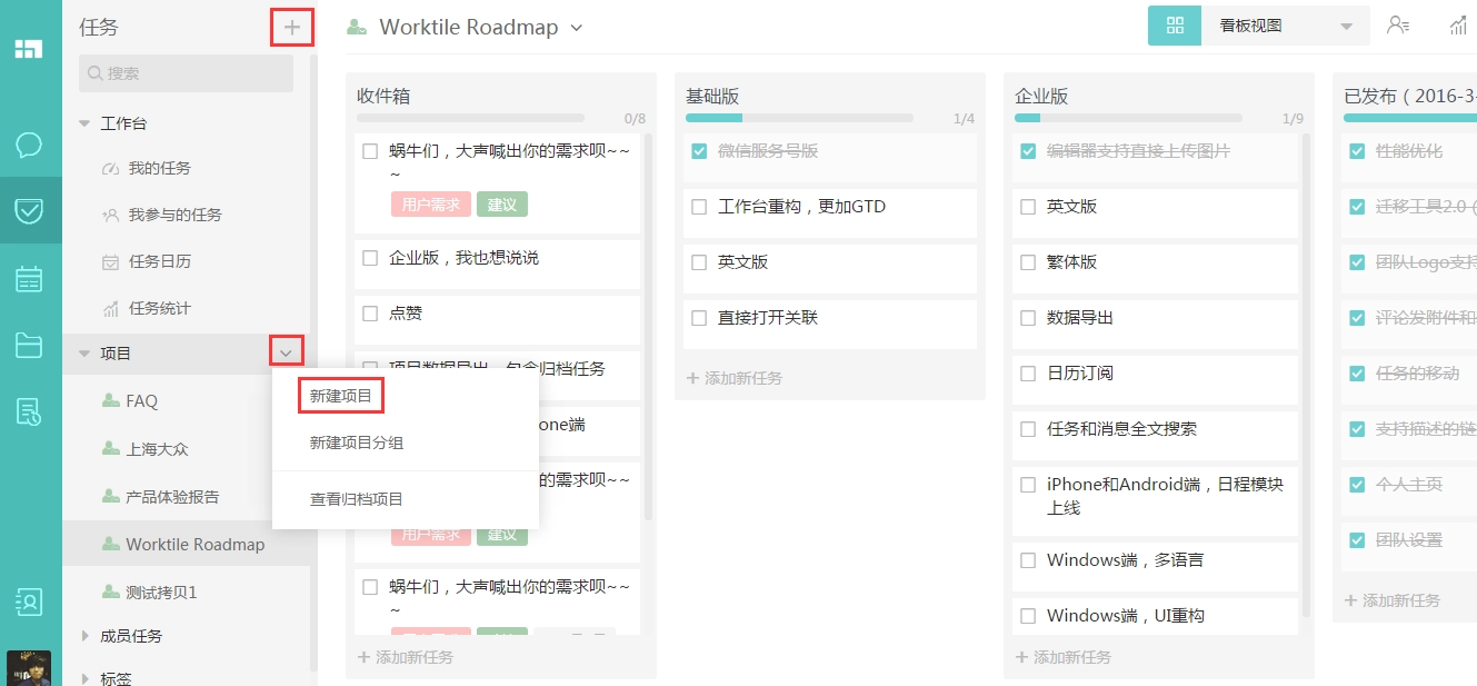 进入任务模块后,您能够创建项目(不过并非所有成员都具备创建项目的权限,该权限可由企业所有者在企业后台完成设置,具体操作请参见应用管理-任务-权限设置)。若要新建项目,您可以点击任务右侧的“+”按钮,或者通过项目列表右侧的“下拉菜单-新建项目”选项来进行相关操作。