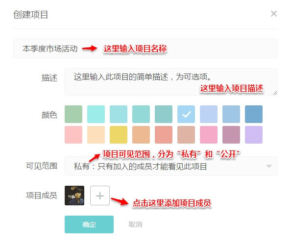 输入项目的基础信息,包括名称、描述与颜色,并对可见范围和项目成员进行选择。