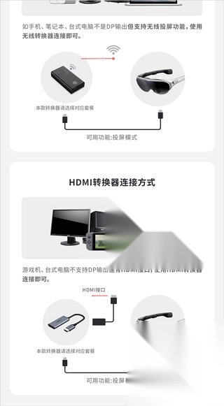 对于不支持DP输出的设备(比如苹果手机),可以借助无线投屏或者转接器来和AR眼镜相连。