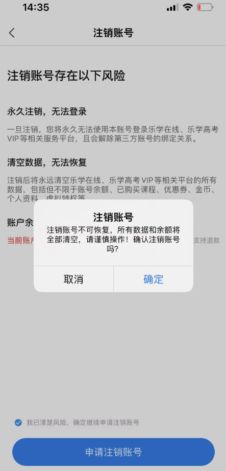 在确认账户已无余额后,请勾选屏幕下方的“我已清楚风险,确定继续申请注销账号”选项,随后点击“申请注销账号”按钮。