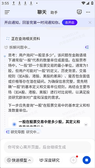 要是对当前的回答不太满意,还能点击“深度研究”,系统会更深入地为你剖析问题。