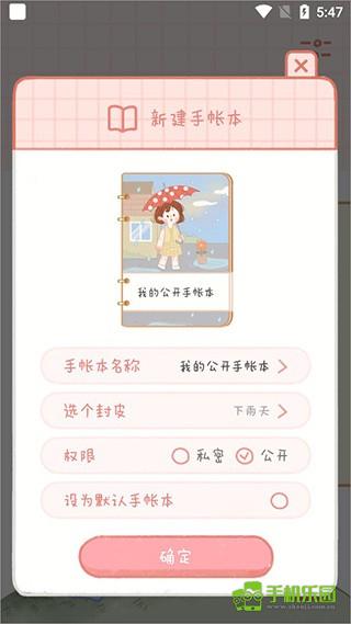 3、新建手账时,你可以为其设置名称、封皮、权限,还能选择是否设为默认手账,点击确定就能完成手账的新建。