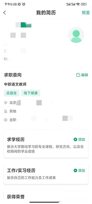 填写你的个人信息、求职意向、求学经历、工作或实习经历等信息;