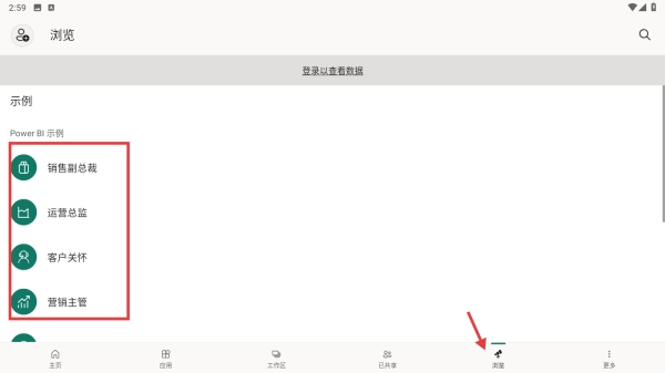 点击浏览板块,就能查看示例内容,像销售副总裁、运营总监、客户关怀、营销主管等Power-BI示例都包含在内,登录之后还可以查看更多数据。