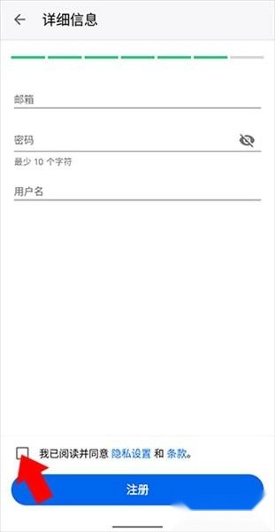 3、填写相应资料后,来到最后一步也就是填写邮箱与密码以及用户名,填写完成之后点击下方的我同意相应条款最后点击注册即可进入应用
