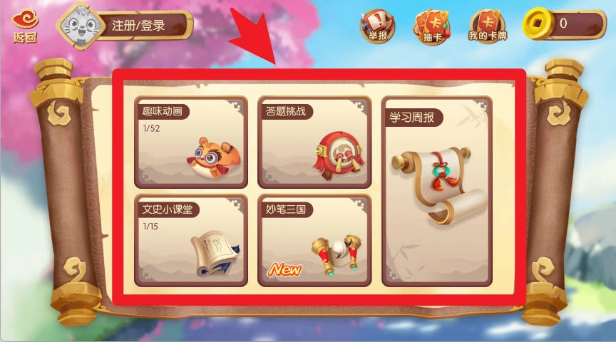 在首页能够选择三国小百科、大探险家、西游小百科或者桌游教学等栏目,进而进入不同的学习体验模块。