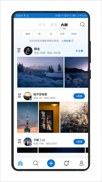 流畅的动态效果能让你持续浏览关注摄影师的作品,以及系统根据他们喜爱内容推荐的相关作品。