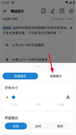 在设置选项中,能够选择背题模式,把答题模式调整为背题。