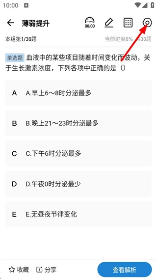在答题页面,点击右上角设置图标,弹出设置选项。