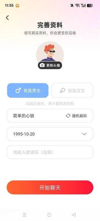 完成快捷注册登录后,先把个人资料信息补充完整,设置好个人头像、性别和昵称,等这些信息都填好就能进入软件内部了。