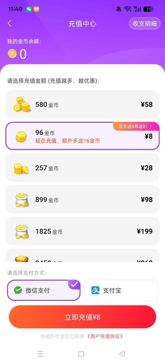 在线上支付时选择对应的金币数量,再通过微信或支付宝完成购买操作。