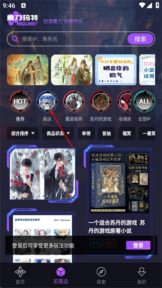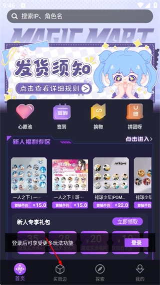 打开魔力玛特应用,在首页找到并点击“买周边”选项,即可进入周边商品的购买页面。