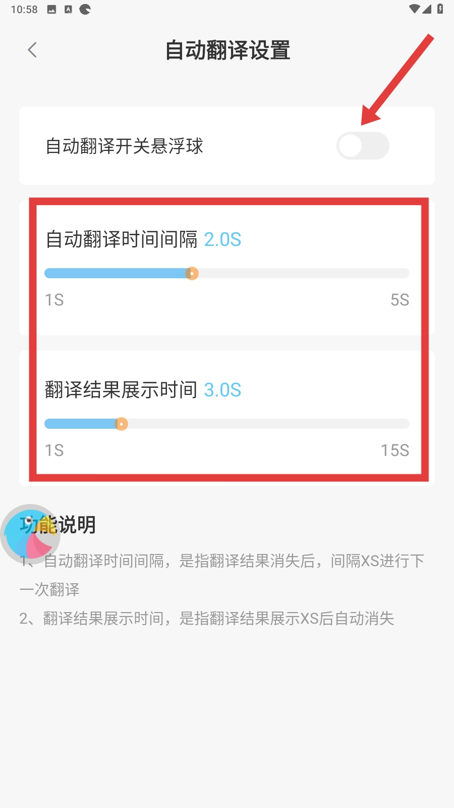 进入【自动翻译设置】页面,打开【自动翻译开关悬浮球】功能,此外还可以调整【自动翻译时间间隔】等参数,根据自身需求进行设置,非常贴心。