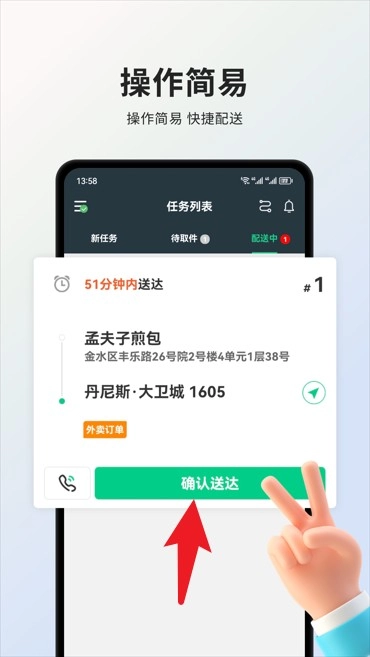 操作简单,接单便捷,骑手只需轻点按钮就能确认送达任务,无需复杂流程,可快速响应。