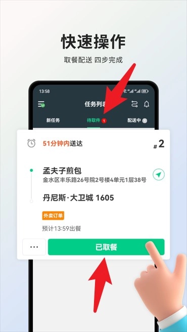 操作流程四步即可快速完成,从接单到取餐的界面设计直观清晰,骑手能够一键确认已取餐的状态。