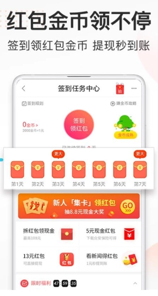 用户还能通过每日登录获取金币,完成金币签收后,就可以用金币兑换对应的红包,整个流程简单又高效。