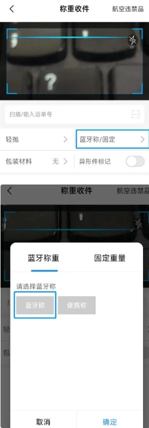 3、在称重收件界面,点击【蓝牙秤/固定】进入蓝牙秤设置,选择【蓝牙秤】后,显示手机搜到的蓝牙设备名称和地址,选择“XS-BLE”;再点击确定。(蓝牙秤名称和地址,秤仪表后侧有印)