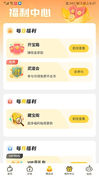 进入【福利中心】界面后,你可以选择参与每日福利、每周福利、每月福利等多种不同类型的福利活动。