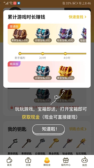 进入【赚现金】页面,我们能够通过玩游戏积累时长来领取宝箱,开启宝箱后就能得到现金奖励。