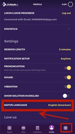 点击Profile栏后向上滑动屏幕,找到并选择NATIVE LANGUAGE选项。