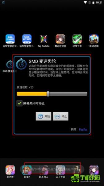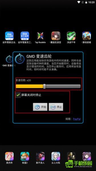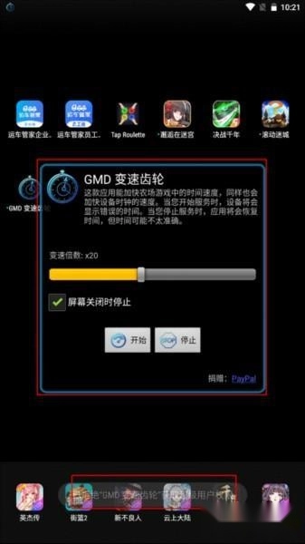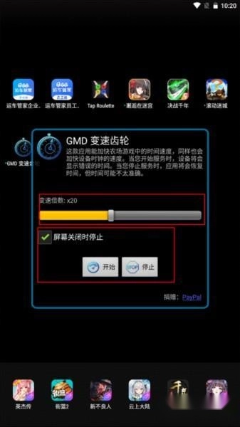 1、启动gmd变速齿轮后,界面上会显示变速倍率调节按钮、“屏幕关闭时停止”的勾选选项,还有开始与停止按钮,此时点击开始按钮即可。