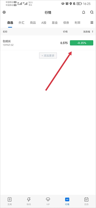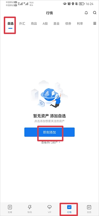 打开华尔街见闻应用,进入行情界面后找到自选功能板块,点击其中的“即刻添加”按钮。