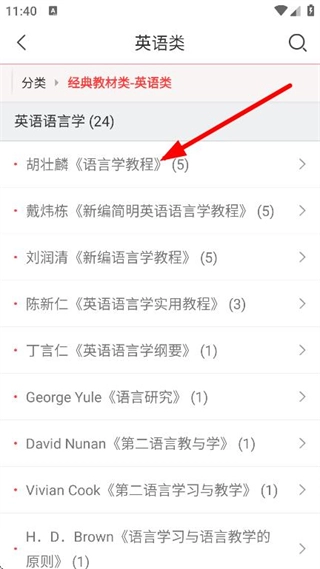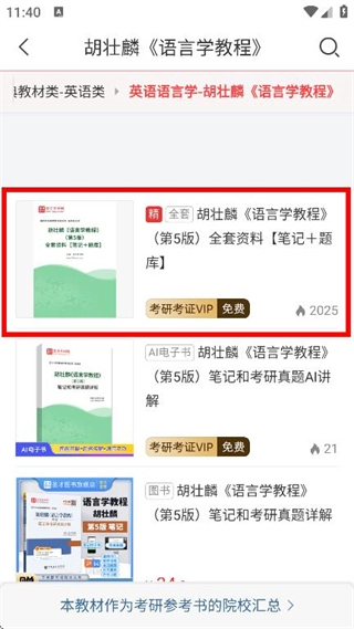 在英语类内容页面,点击胡壮麟语言学教程,进入该教材相关资料页面。